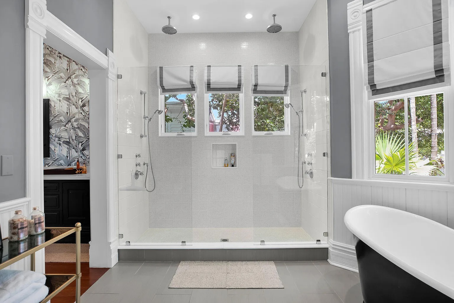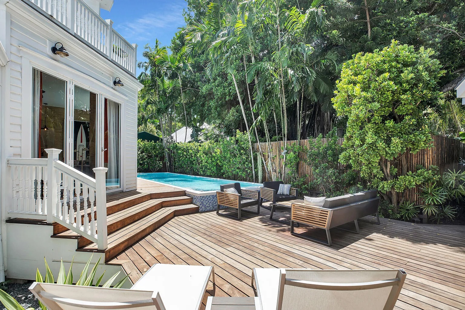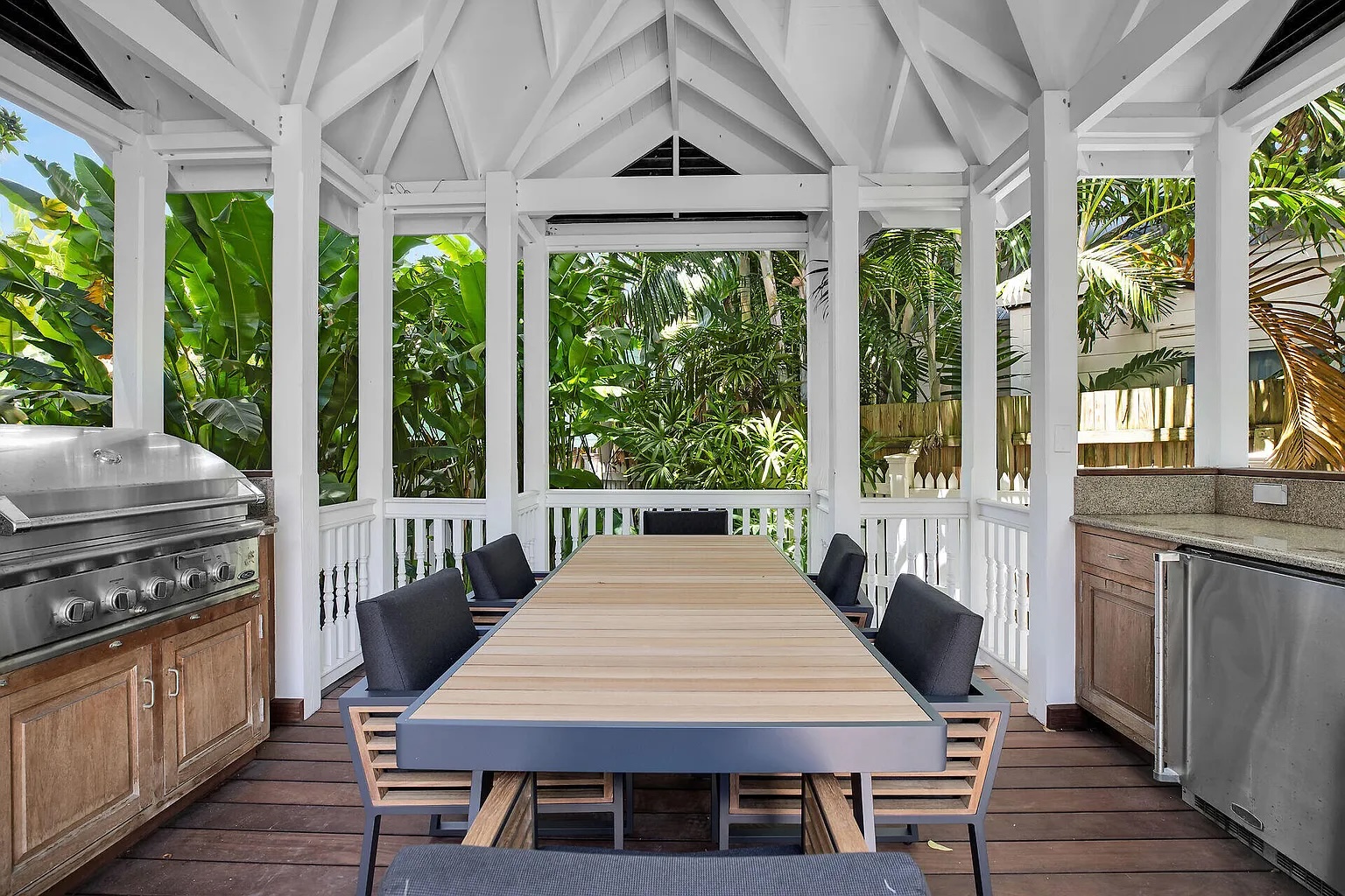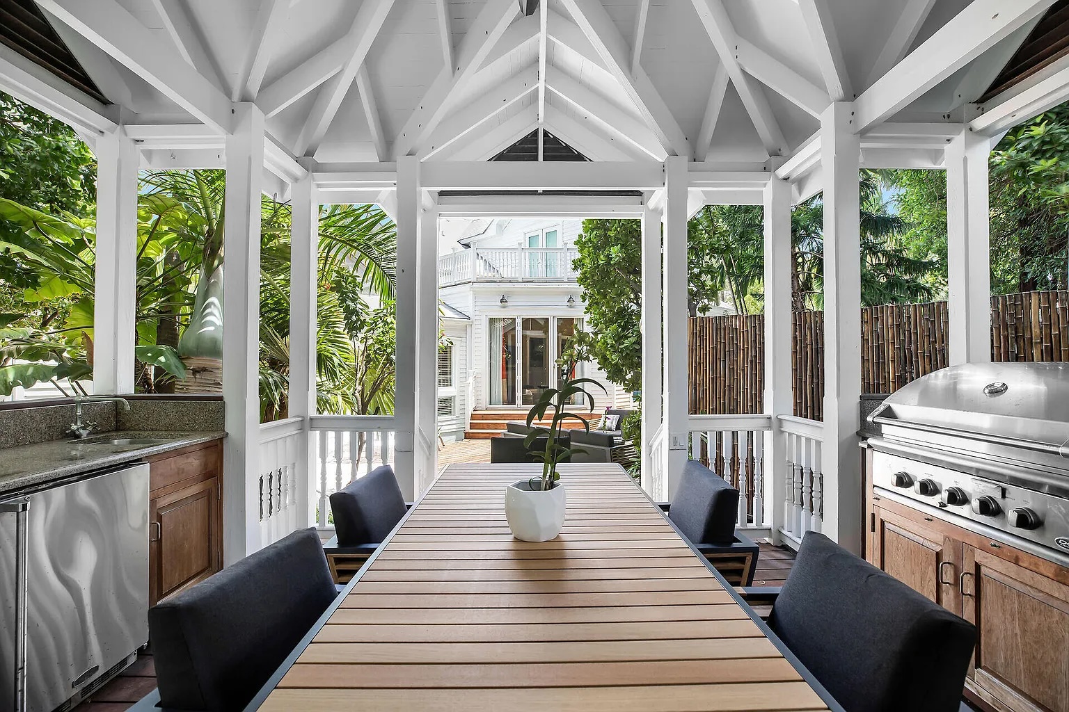 Step outside to your own resort-style oasis. The expansive backyard features a large in-ground lap pool, Ipe wood decking, outdoor shower, and a covered dining gazebo with a built-in Wolf grill, perfect for entertaining or relaxing after a day in the sun. With two gated, brick-paved driveways and offered turnkey, this exceptional Old Town property provides privacy, comfort, and the ultimate Key West vacation experience.