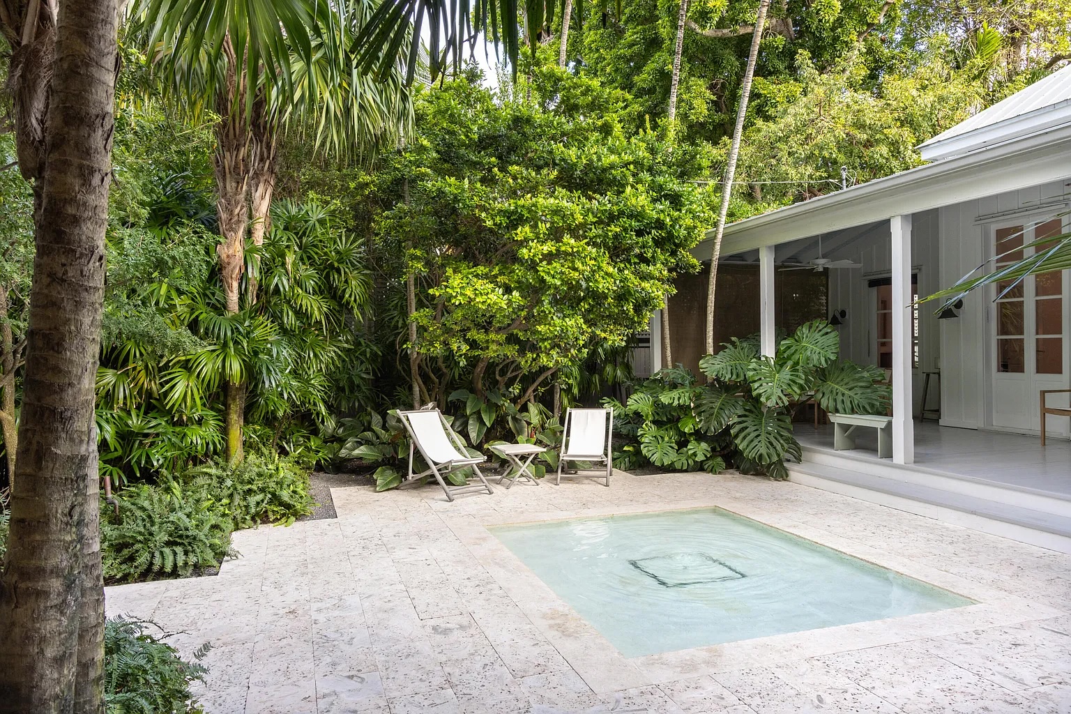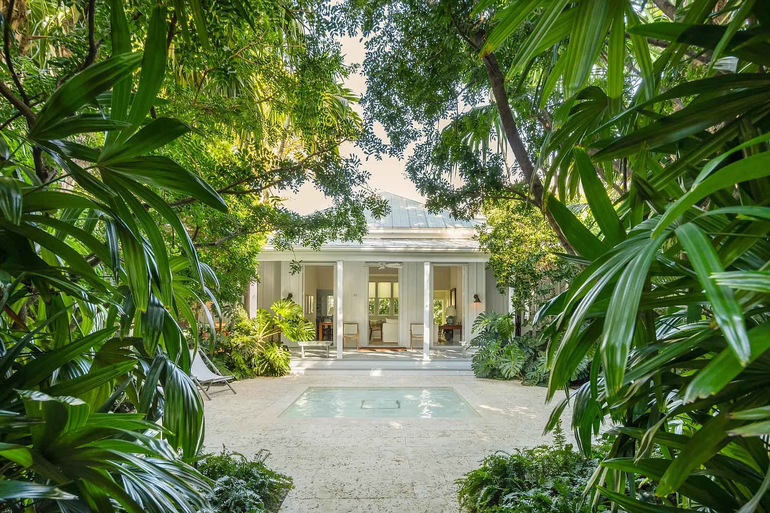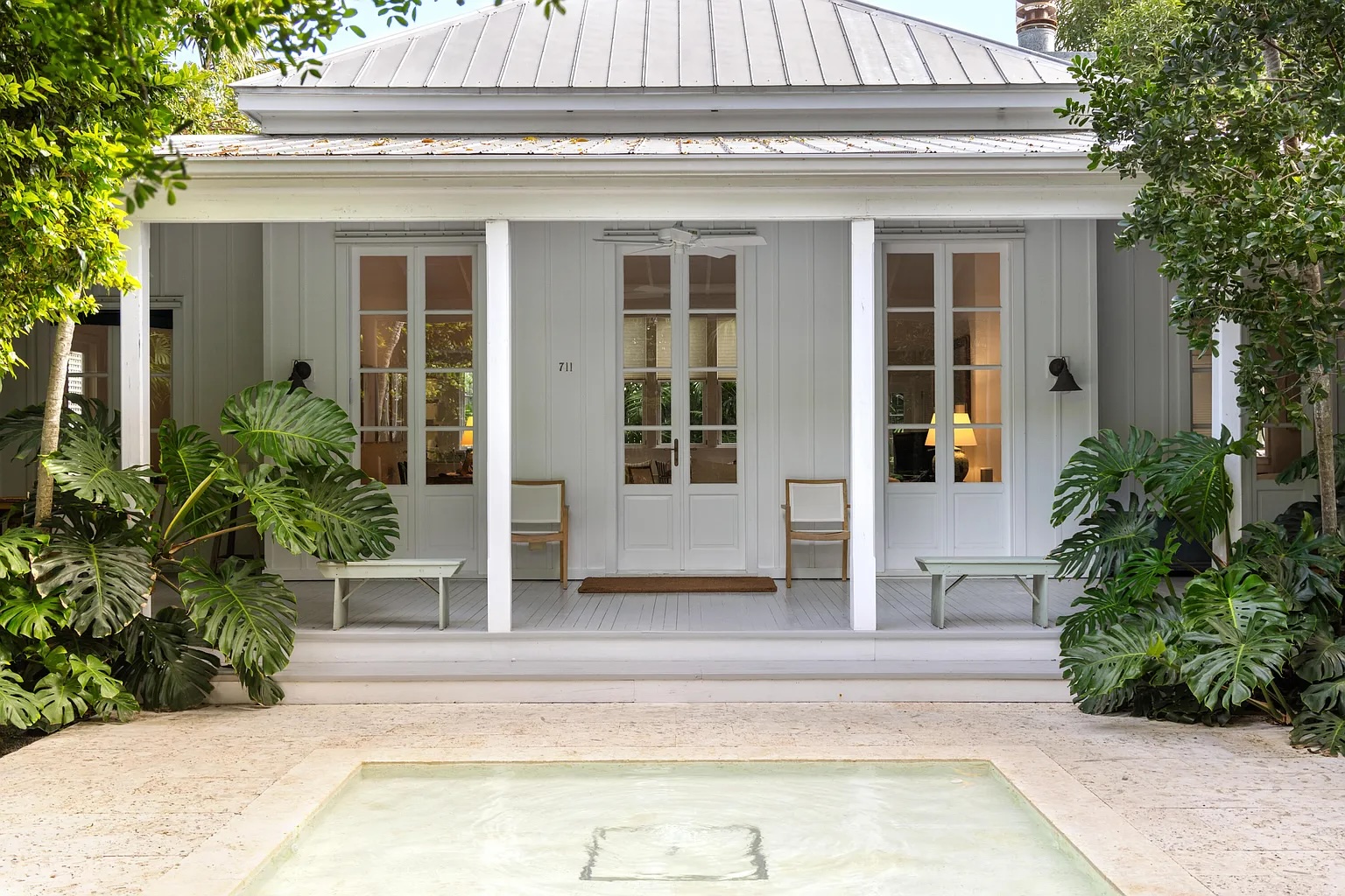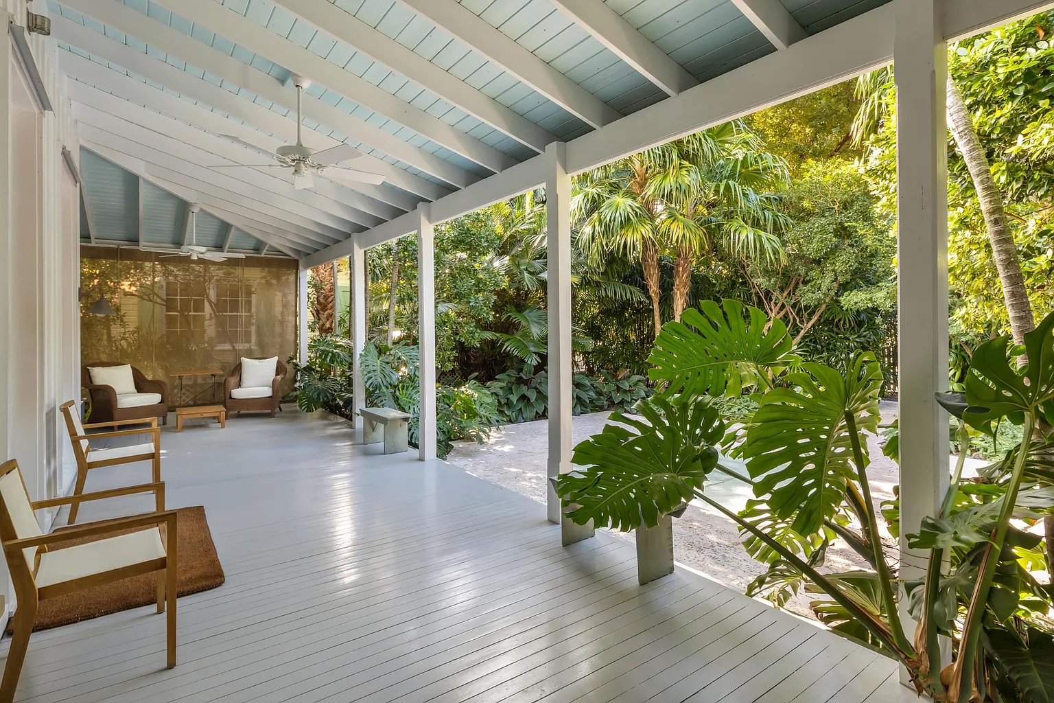 Follow a charming lush tropical pathway into a private indoor-outdoor retreat in the heart of Key West. Framed by exotic palms and tranquil water features, this classic island home feels like a hidden garden sanctuary. A spacious covered porch overlooks one of the property’s most captivating highlights its beautifully layered, serene landscaping designed for quiet mornings and relaxed evenings.