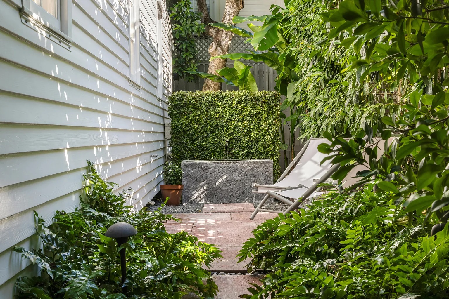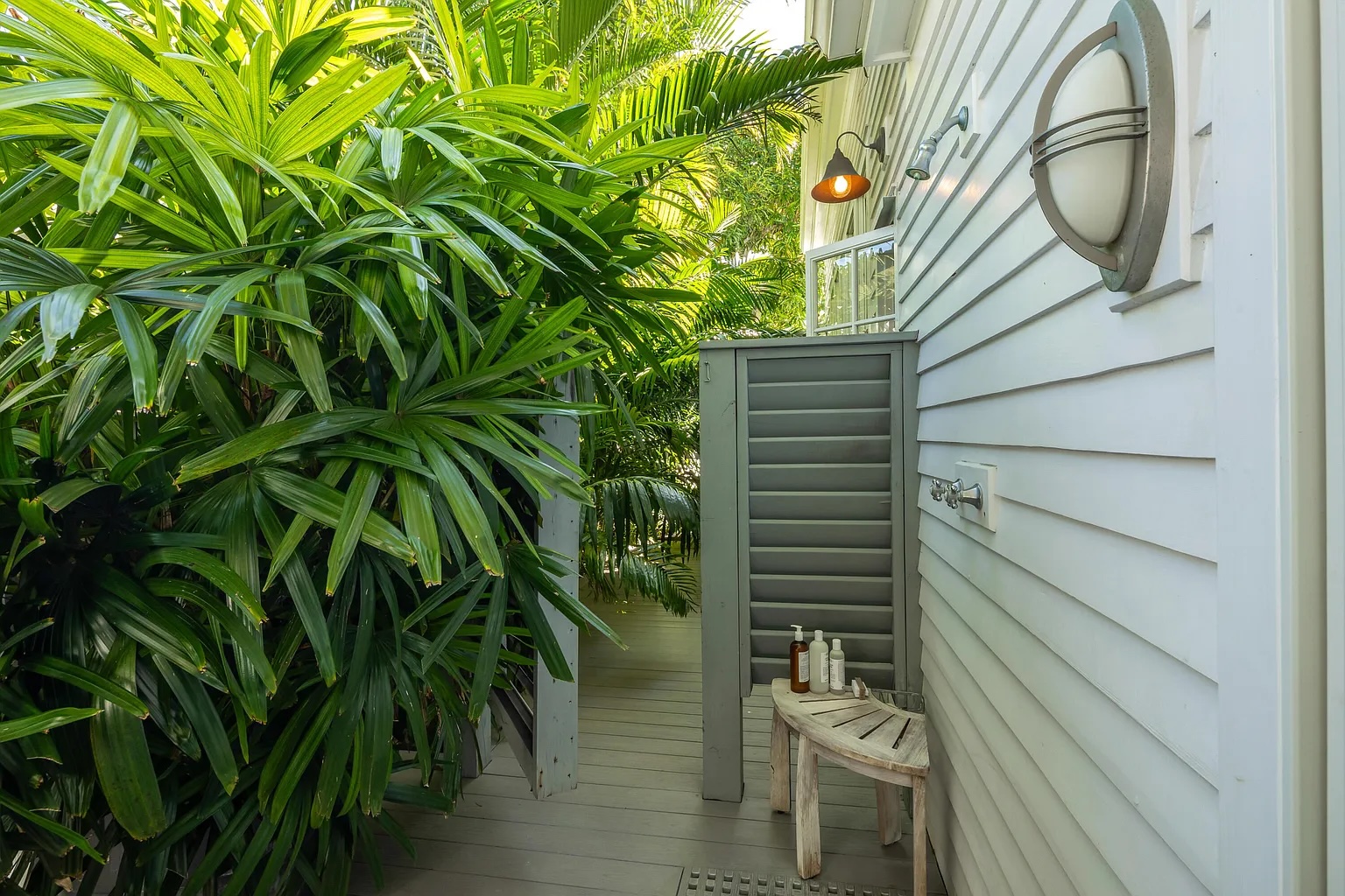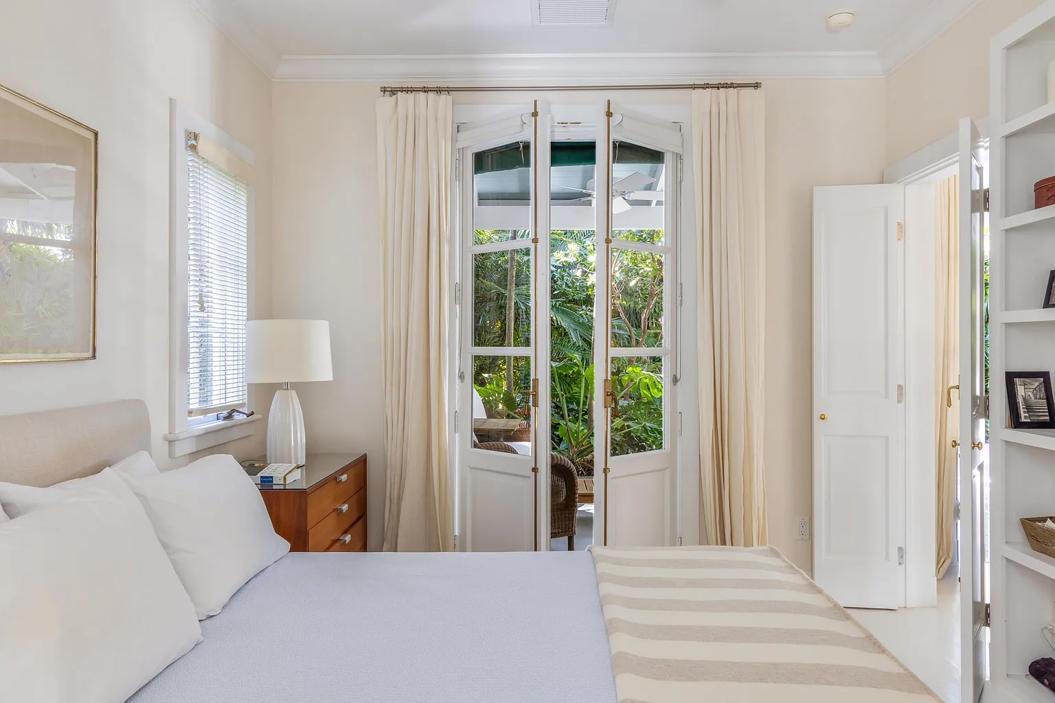 Inside, soaring 12-foot ceilings, elegant French doors, and rich hardwood floors create a bright and open atmosphere. The two-bedroom, two-bath layout offers an easy flow between living spaces, with natural light and garden views from nearly every room. An iconic outdoor shower nestled among vibrant greenery, along with an additional water feature in the side garden, enhances the home’s peaceful, tropical character.