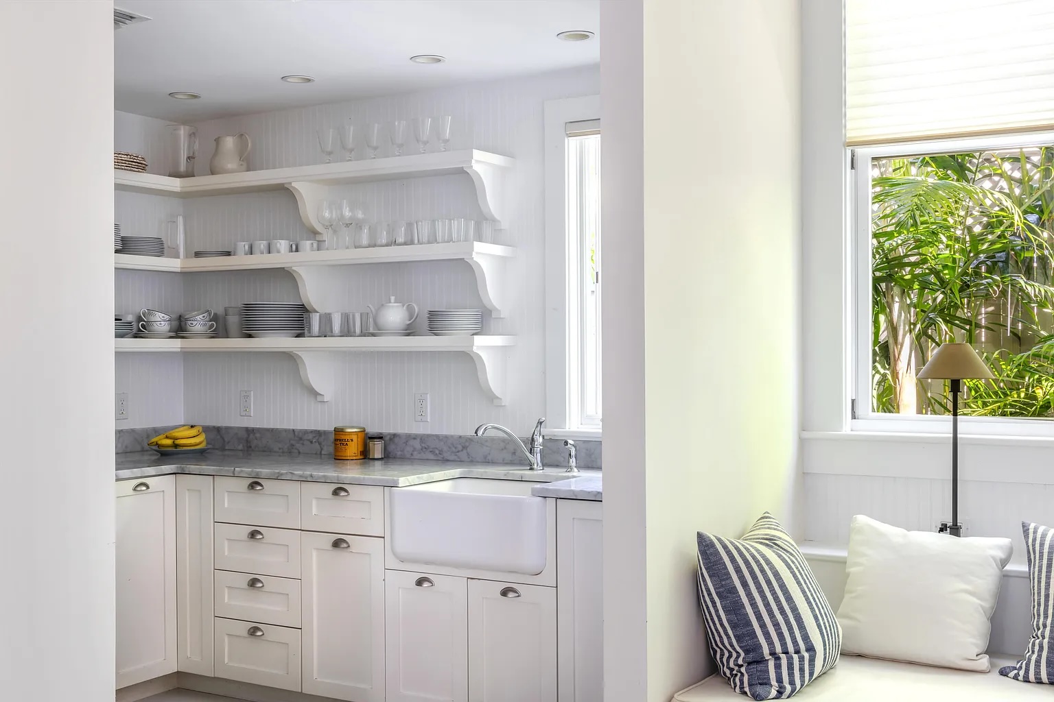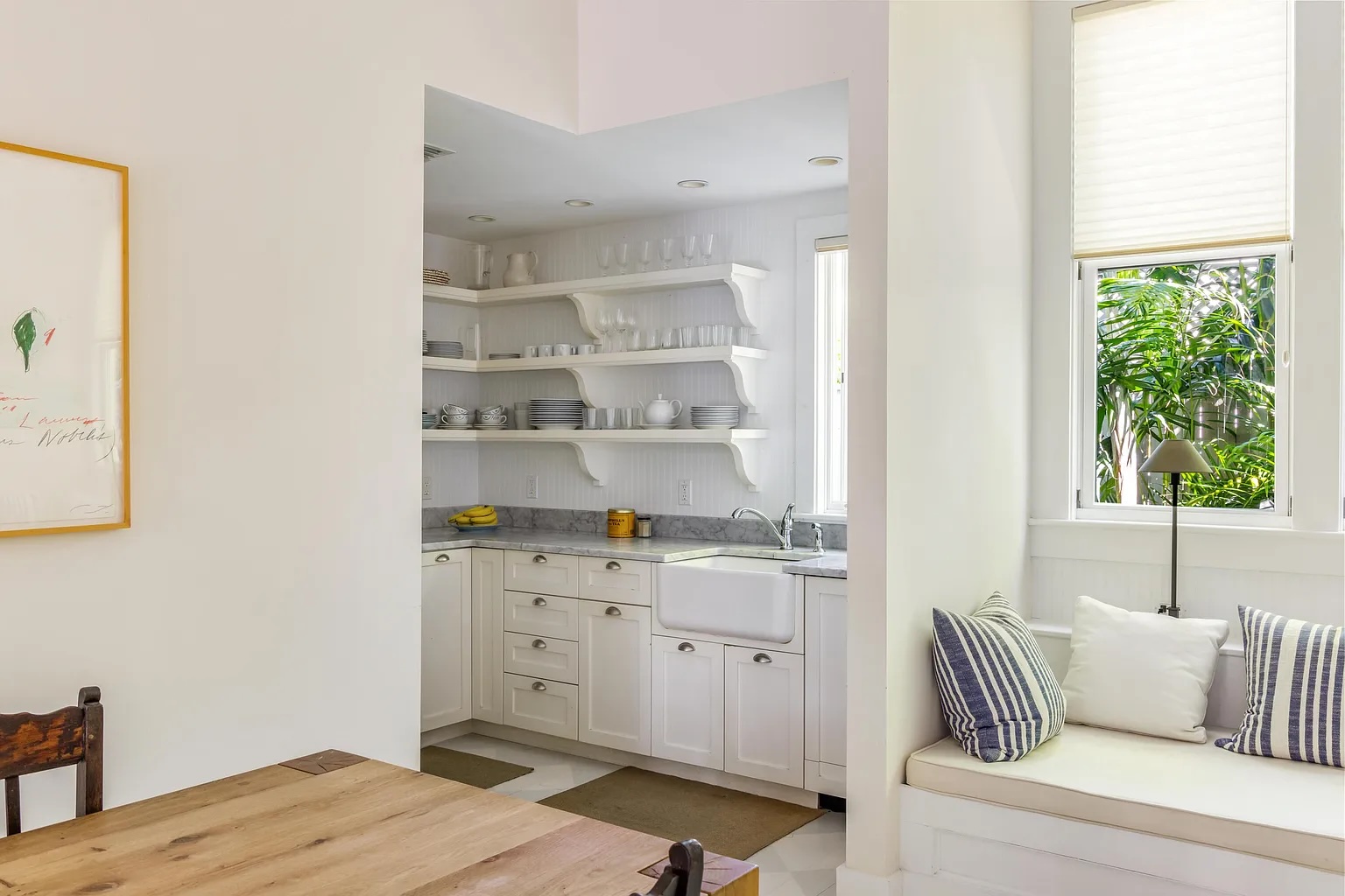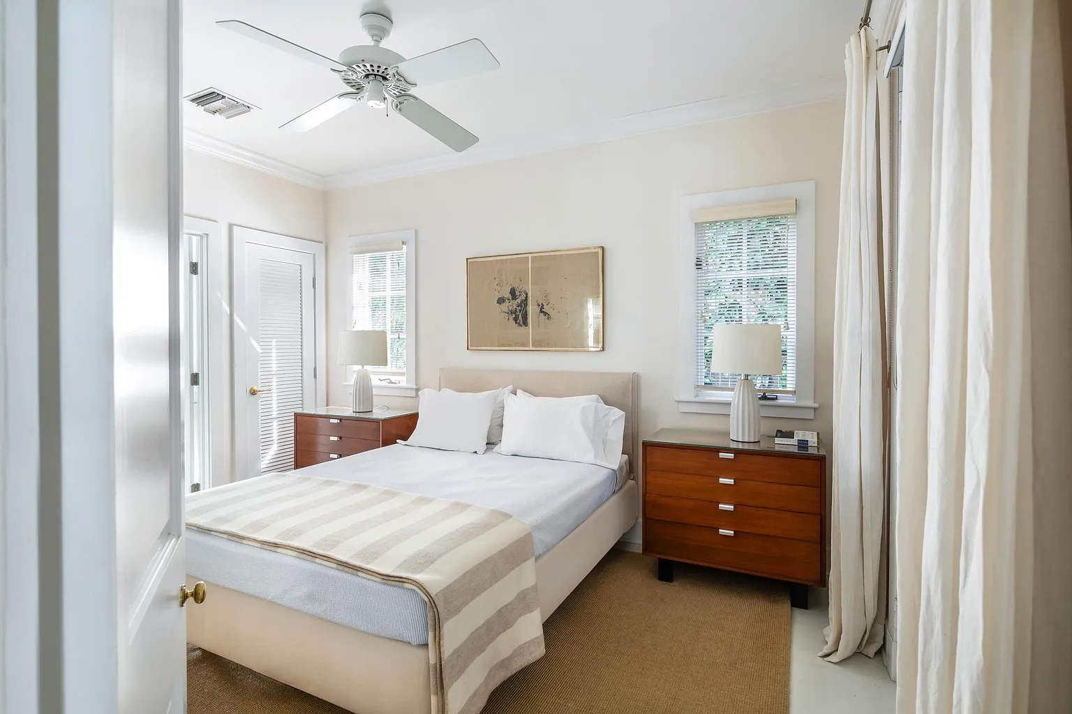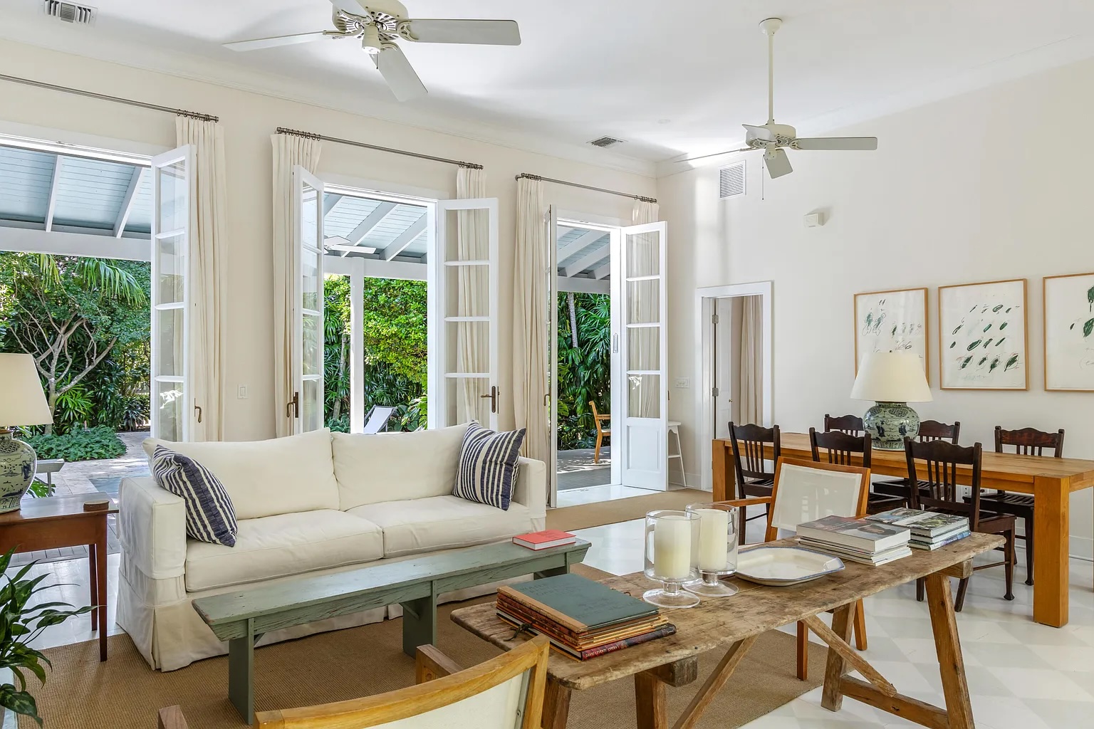 Inside, soaring 12-foot ceilings, elegant French doors, and rich hardwood floors create a bright and open atmosphere. The two-bedroom, two-bath layout offers an easy flow between living spaces, with natural light and garden views from nearly every room. An iconic outdoor shower nestled among vibrant greenery, along with an additional water feature in the side garden, enhances the home’s peaceful, tropical character.