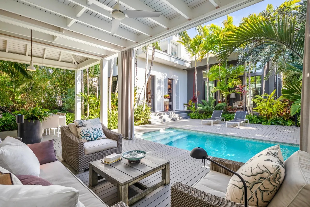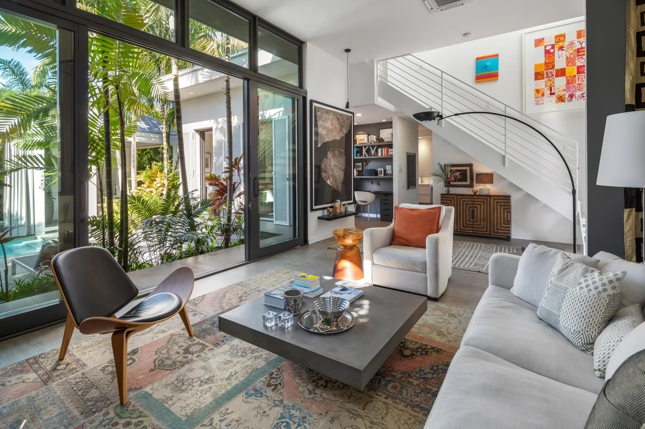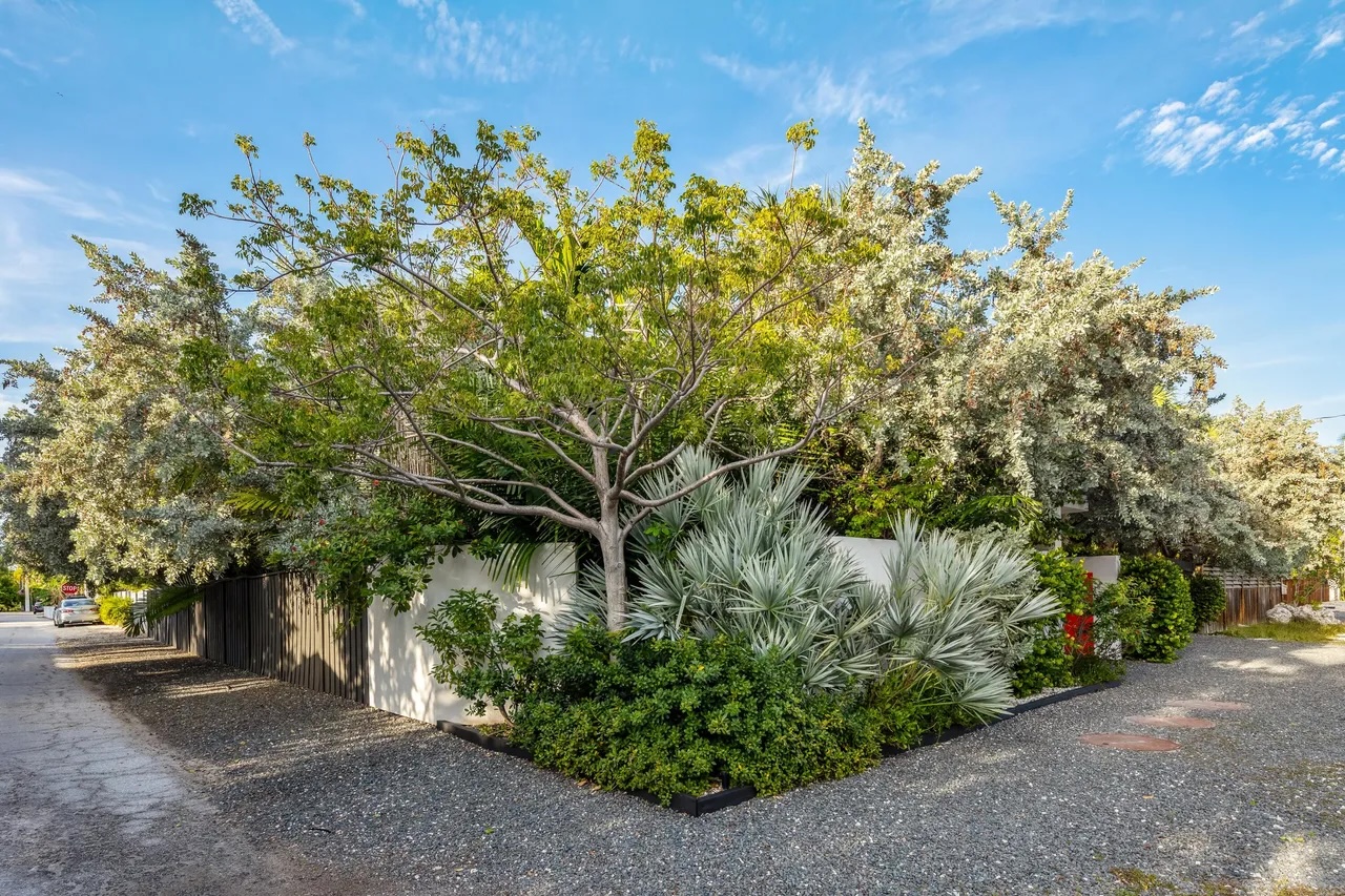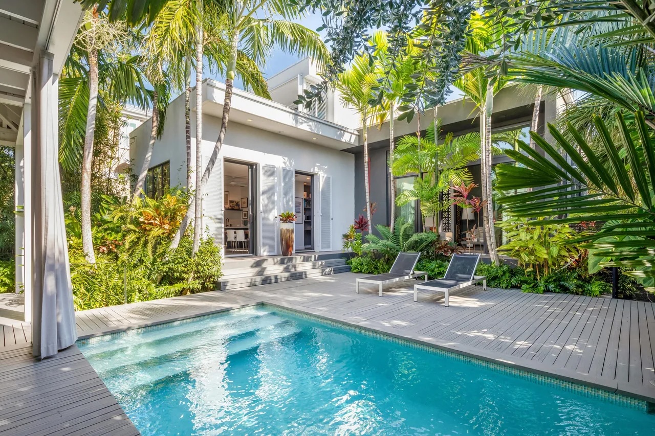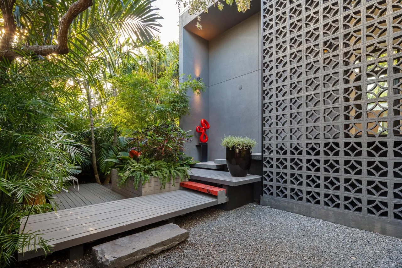 Located near Higgs Beach in Key West, this elevated two-bedroom, two-bath home offers a rare blend of privacy and central convenience. Tucked behind a distinctive red gate and surrounded by tropical landscaping, the property feels peaceful and secluded while remaining close to beaches and island attractions. Clean architectural lines, impact windows, and thoughtful design details create a bright and contemporary atmosphere throughout.
