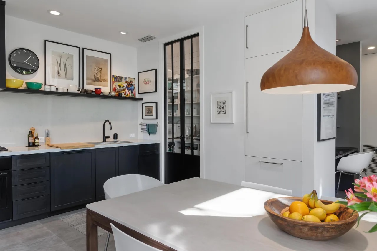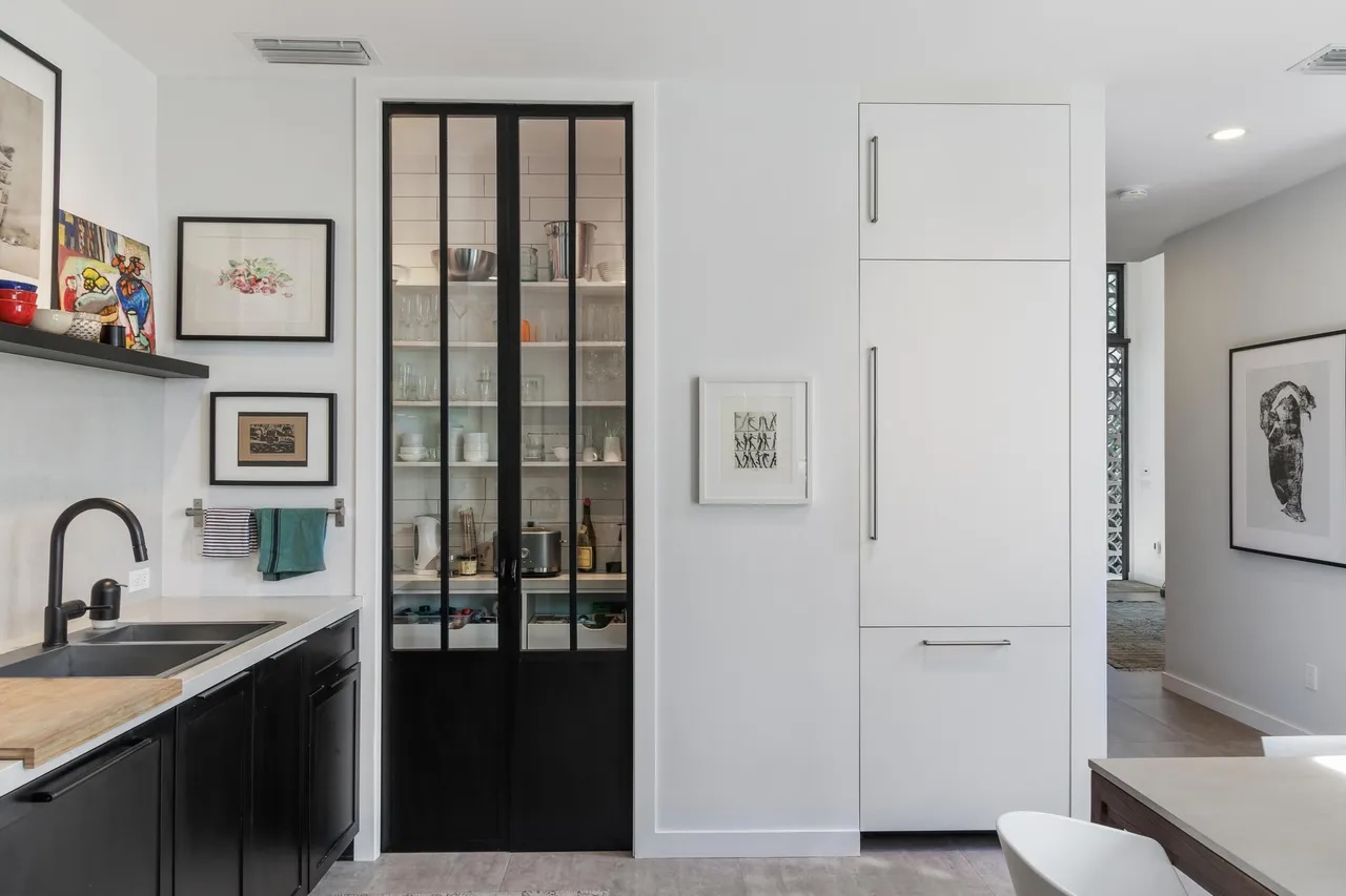 Inside, natural light fills the welcoming entry and flows into the main living area, where floor-to-ceiling windows overlook the pool. The modern kitchen features sleek cabinetry, striking black-and-white finishes, and quality appliances, opening easily to the dining area and outdoor deck for relaxed entertaining. A first-floor guest bedroom and full bath offer comfort and flexibility.