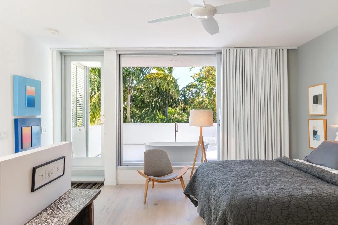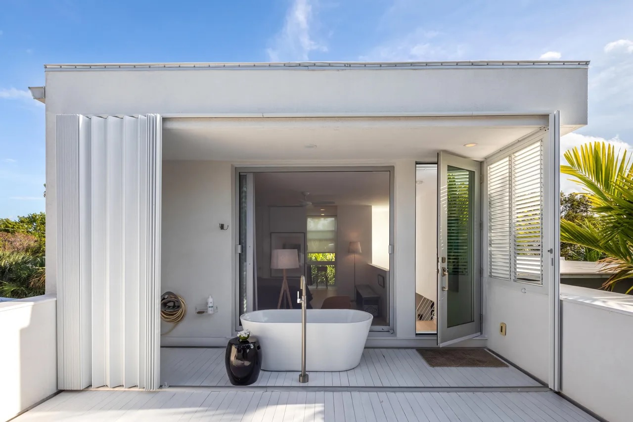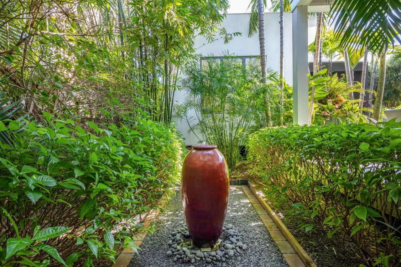 Upstairs, the primary suite provides a quiet retreat with abundant windows, a spacious walk-in closet, and access to a private balcony complete with a soaking tub. Outdoors, the home continues to impress with a pool, covered lounge space, outdoor shower, and a dedicated grilling and dining area. A tranquil garden corner with a fountain adds a calming touch, making this home an inviting place to unwind after a day enjoying Key West.