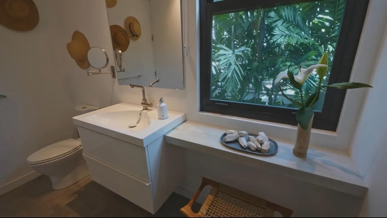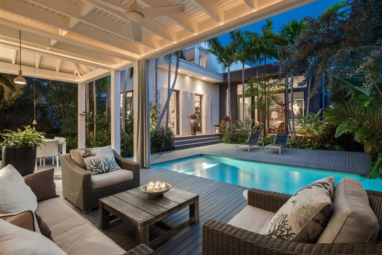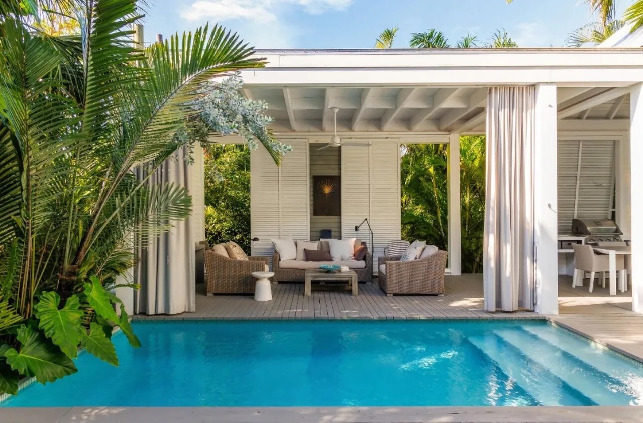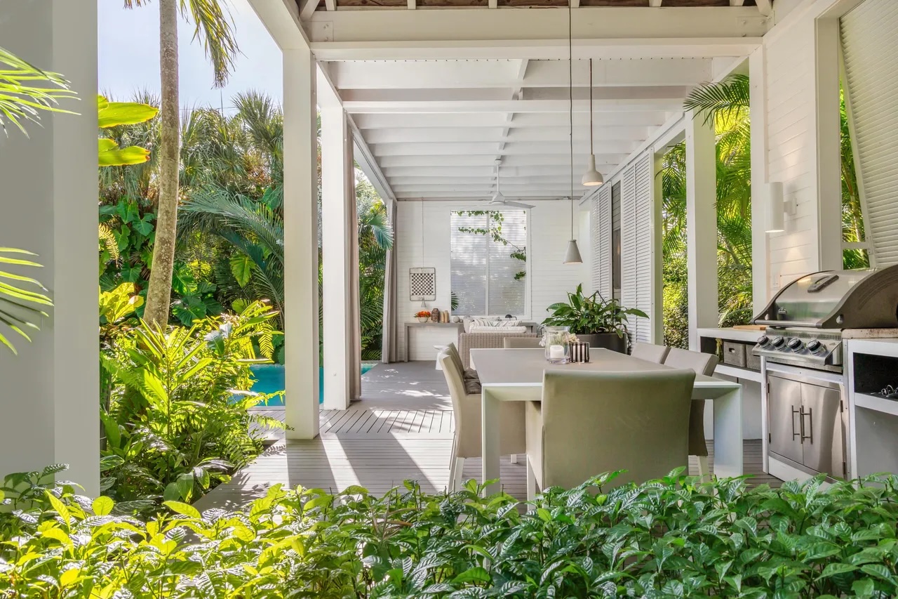 Upstairs, the primary suite provides a quiet retreat with abundant windows, a spacious walk-in closet, and access to a private balcony complete with a soaking tub. Outdoors, the home continues to impress with a pool, covered lounge space, outdoor shower, and a dedicated grilling and dining area. A tranquil garden corner with a fountain adds a calming touch, making this home an inviting place to unwind after a day enjoying Key West.