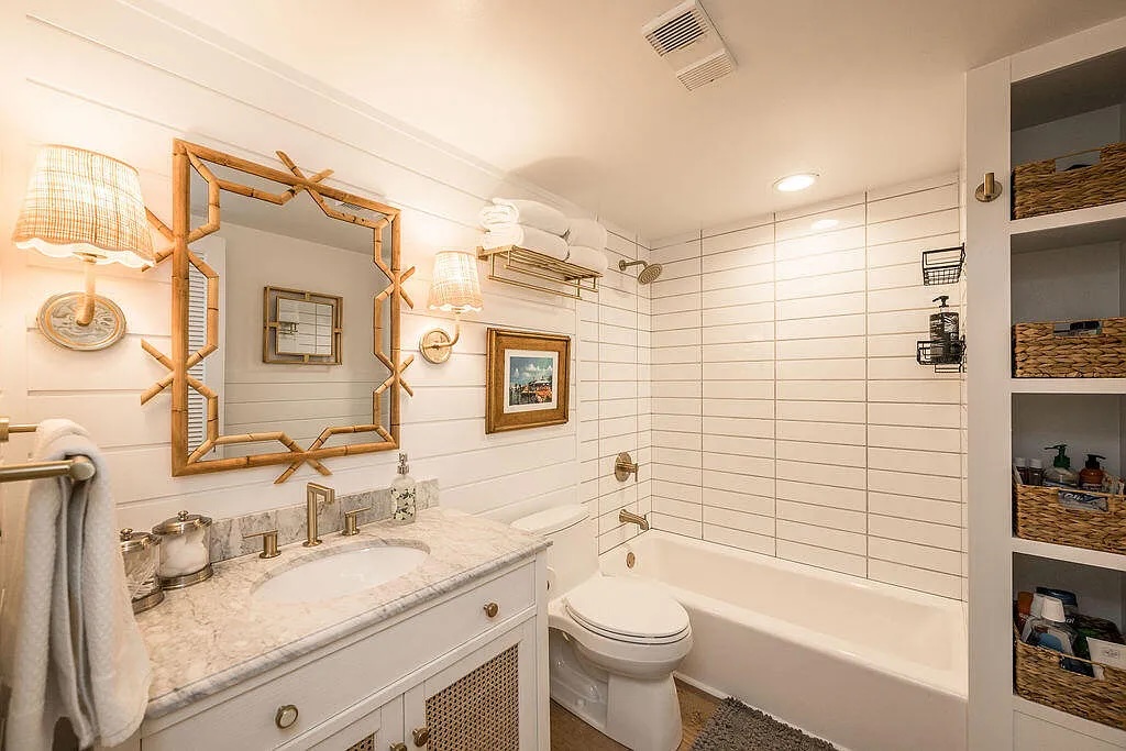 Inside, the interior features wide-plank engineered hardwood flooring and a modern kitchen with shaker-style cabinetry, quartz countertops, and updated appliances, including a dual-zone wine refrigerator. The bathroom is thoughtfully designed with custom tile, a cast iron tub, and a marble vanity, creating a calm and refreshing space to start or end your day. An assigned off-street parking space adds to the ease of living in Old Town.